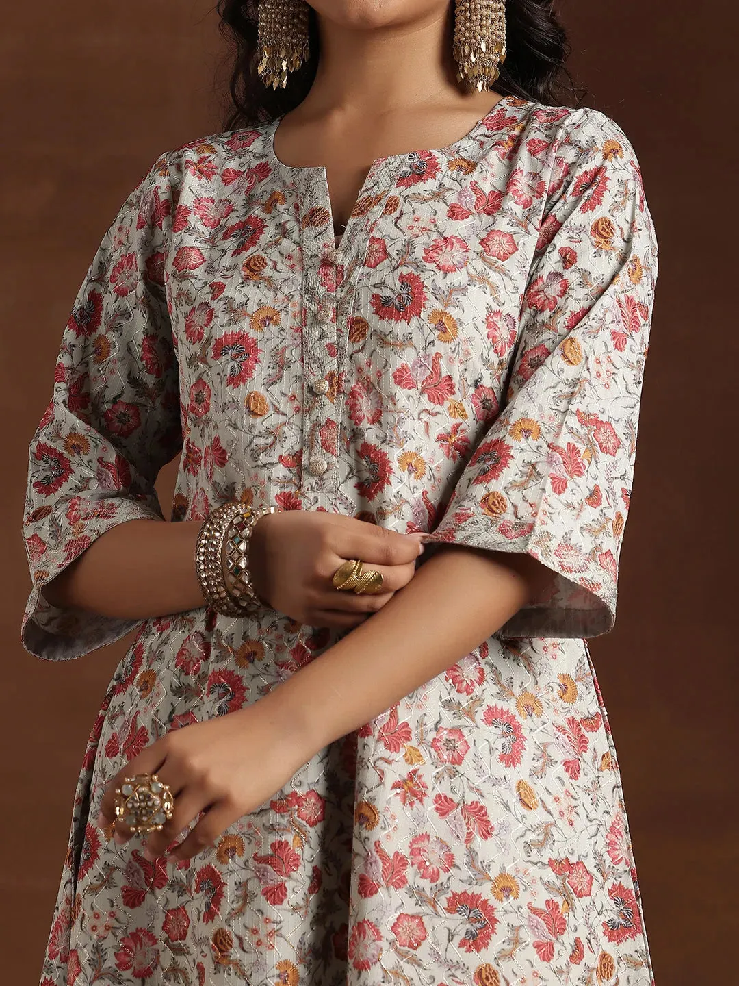 Cream Printed Silk Blend A-Line Kurti