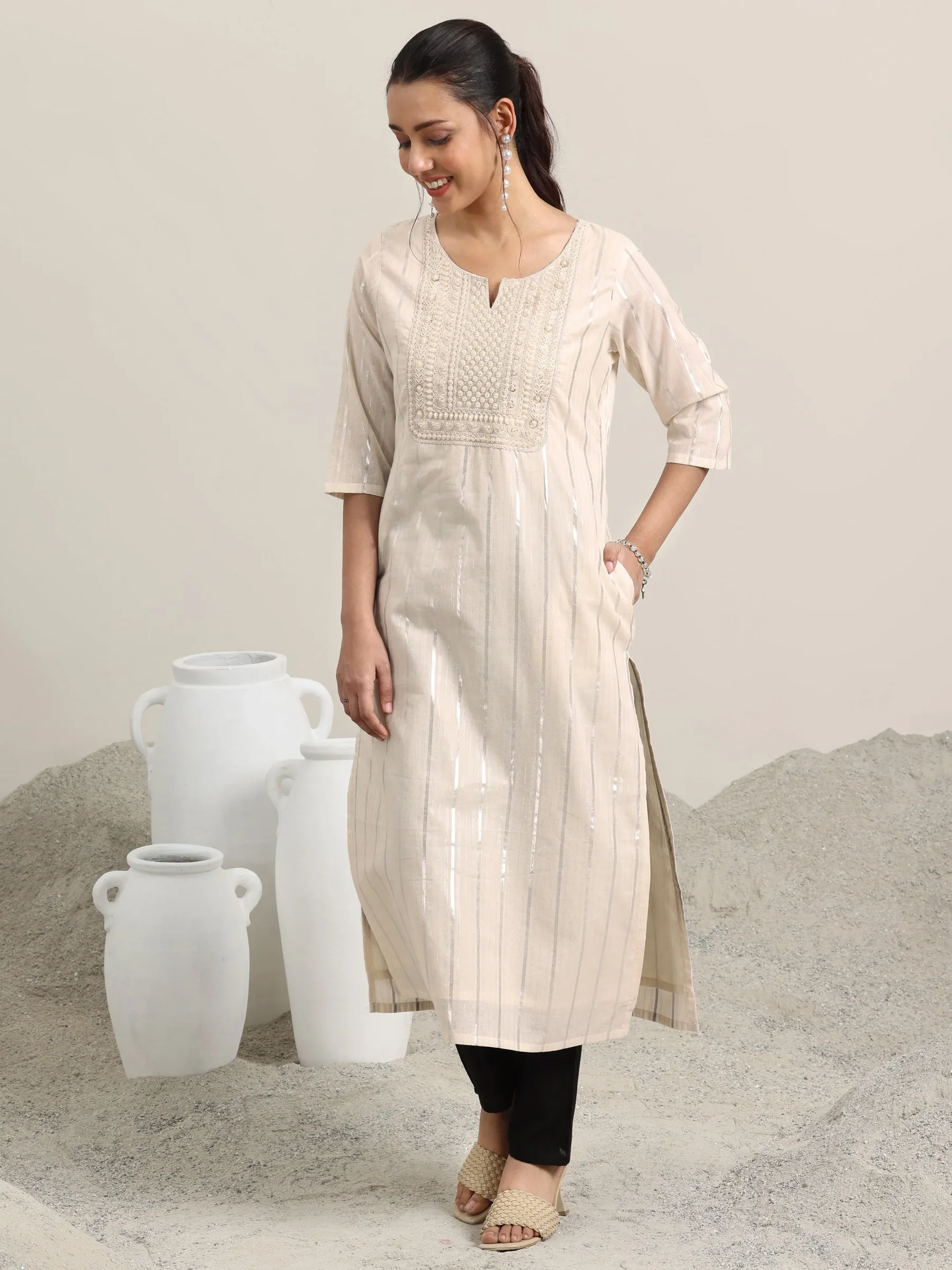 Off White Embellished Cotton Straight Kurta